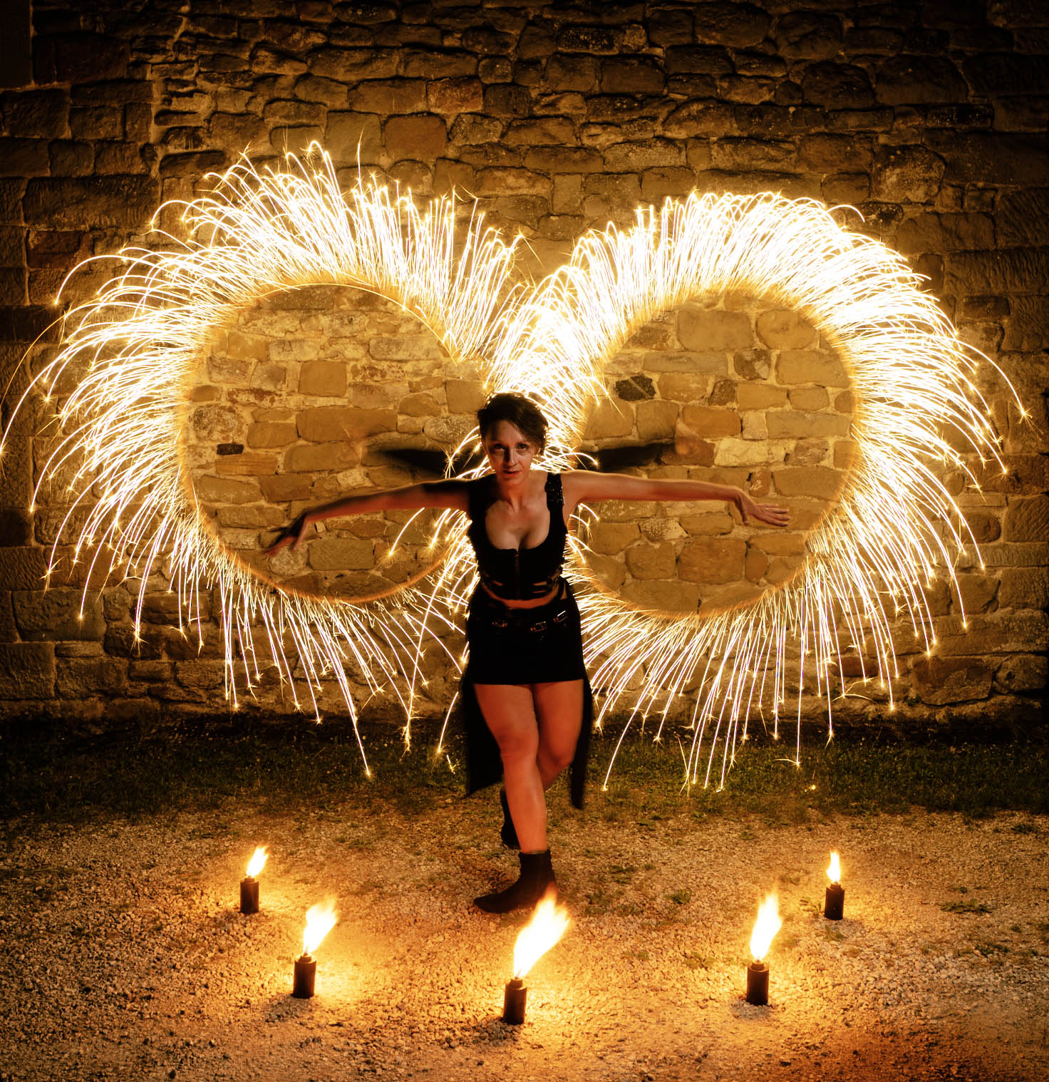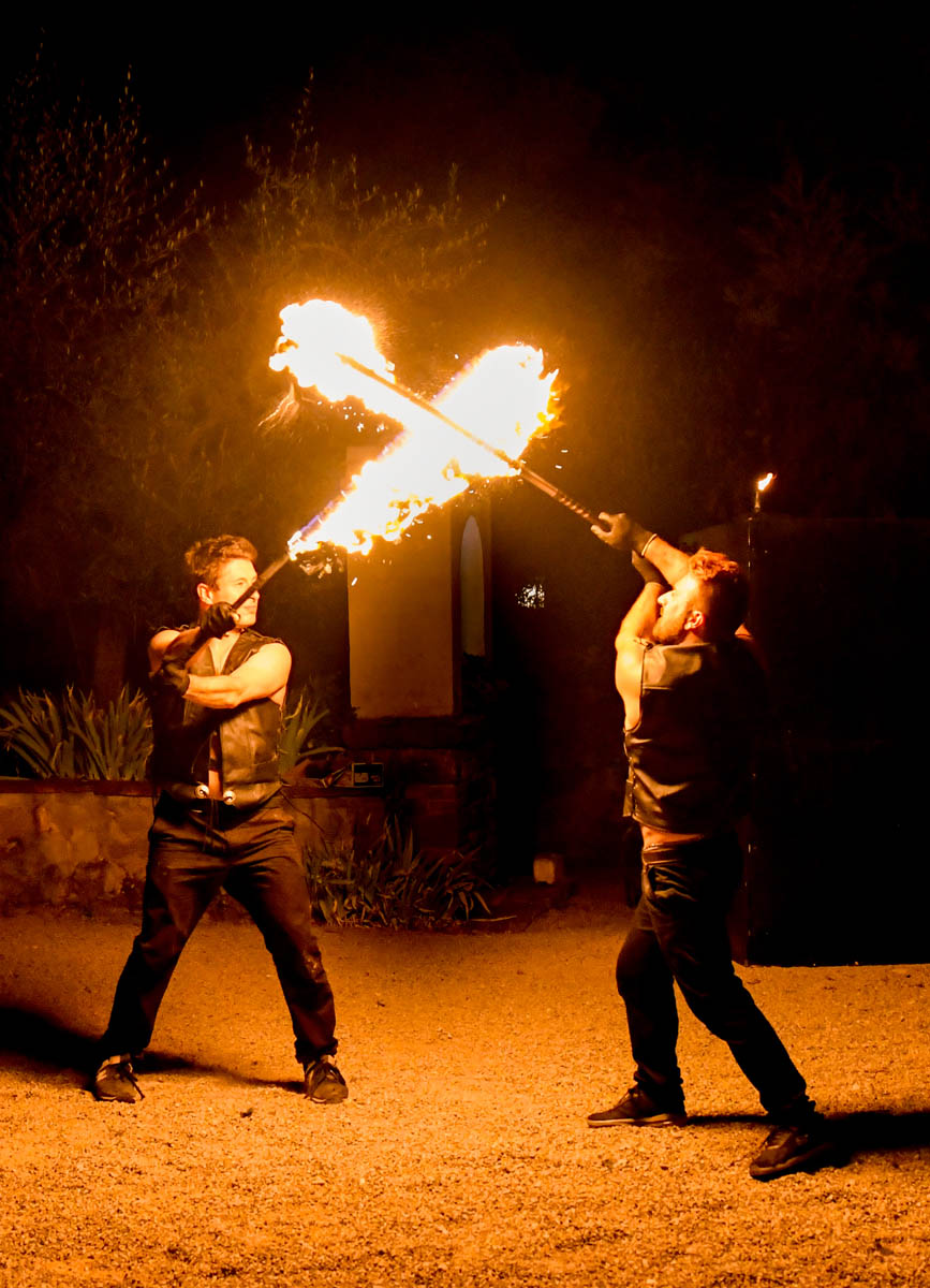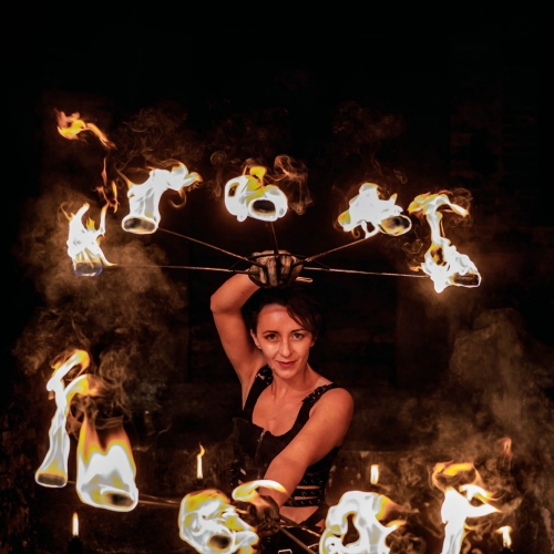 Lo spettacolo di giocoleria con fuoco e danza è adatto per eventi di piazza, festival, feste di paese, notti bianche, matrimoni, inaugurazioni di locali, feste di paese, sagre e discoteche. Giochi di fuoco, show e performance con il fuoco per tutte le occasioni; lo spettacolo è presentabile in diversi formati in modo da poter essere eseguito sia nella grande piazza, che in una cena di gala aziendale, che in un piccolo evento privato.